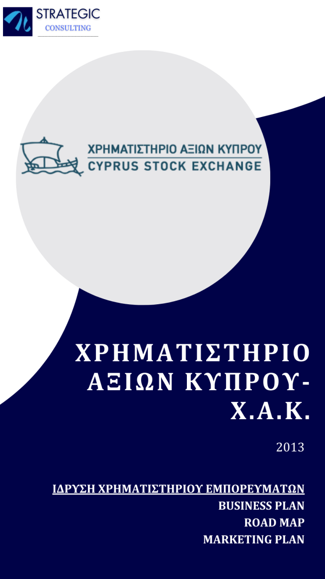 Σε σχέση με τα σχέδια ίδρυσης Χρηματιστηρίου Εμπορευμάτων στην Κύπρο, το Συμβούλιο του Χρηματιστηρίου αποδεχόμενο σχετική πρόταση, μας ανέθεσε τον Οκτώβριο του 2013, τη σύνθεση του αρχικού business plan, του road map και του αρχικού marketing plan στην Εταιρεία μας, πιστοποιώντας με τον τρόπο αυτό και το επίπεδο της τεχνογνωσίας που έχουμε αναπτύξει στο συγκεκριμένο τομέα.