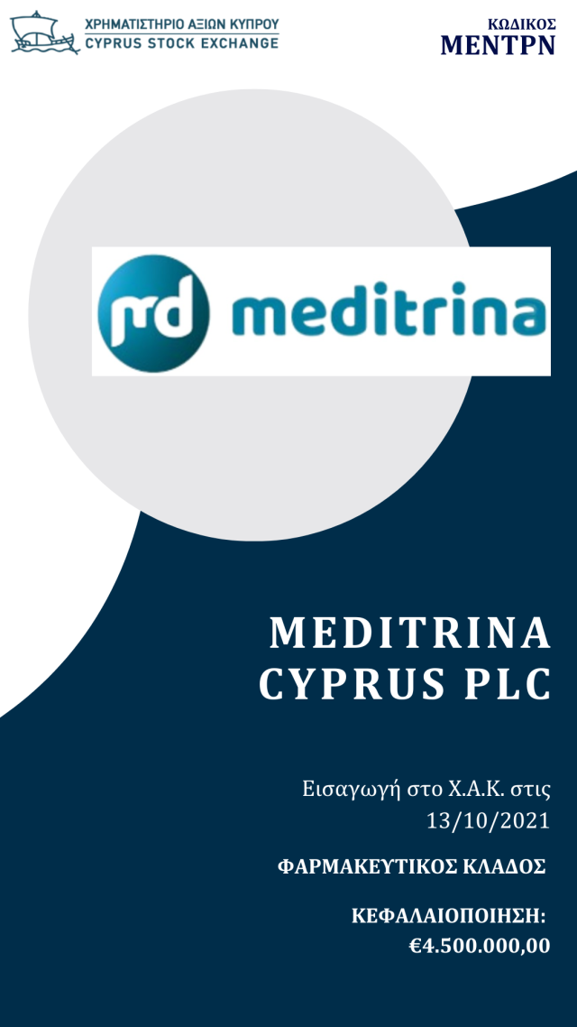 Η Meditrina Cyprus Plc αποτελεί την holding εταιρεία του φαρμακευτικού Ομίλου Meditrina. Ο Όμιλος ασχολείται με την πώληση φαρμάκων, κατά κύριο λόγο OTC (Over-the-Counter) και το εύρος του καλύπτει τις περισσότερες χώρες των Βαλκανίων.