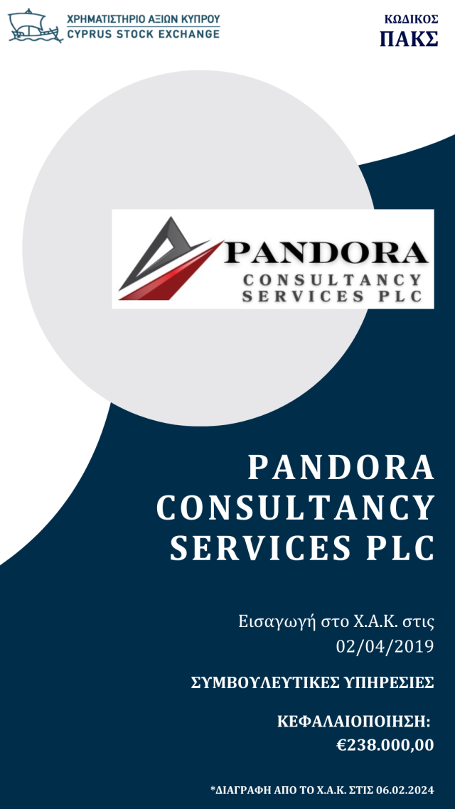 Η Pandora Consultancy Services ήταν επίσης και η πρώτη εταιρεία από το Ηνωμένο Βασίλειο που εισήχθη στη Ν.Ε.Α. αγορά του Χρηματιστηρίου της Κύπρου, με τις μετοχές της να διατηρούνται στο βρετανικό αποθετήριο (CREST) και τη διαπραγμάτευση να διεξάγεται σε βρετανικές λίρες.